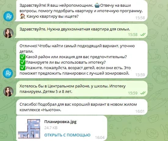 Задает вопросы о составе семьи, образе жизни для персонализированного подбора квартиры. Присылает схемы, фото, видеопрезентации квартир прямо в чат.
